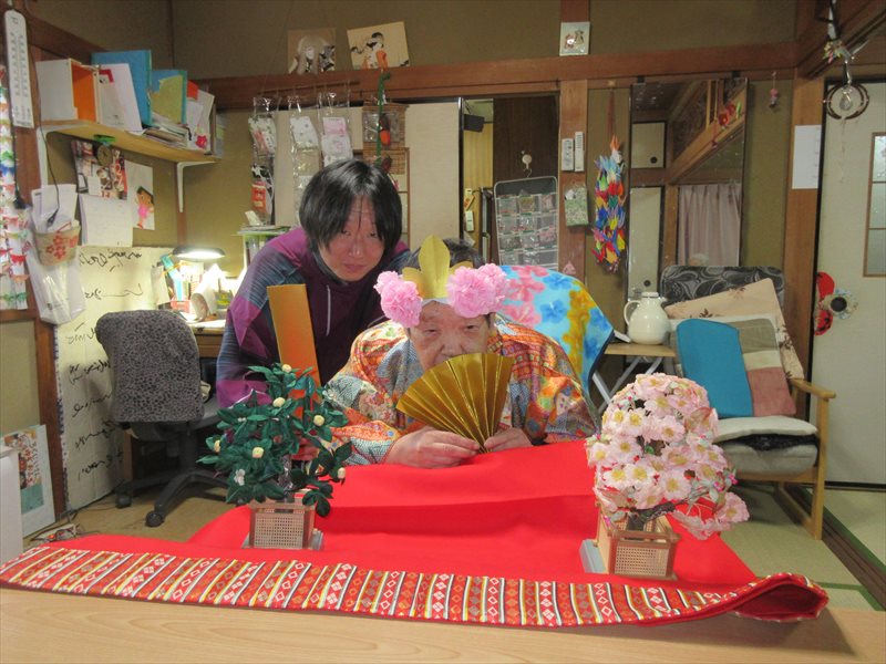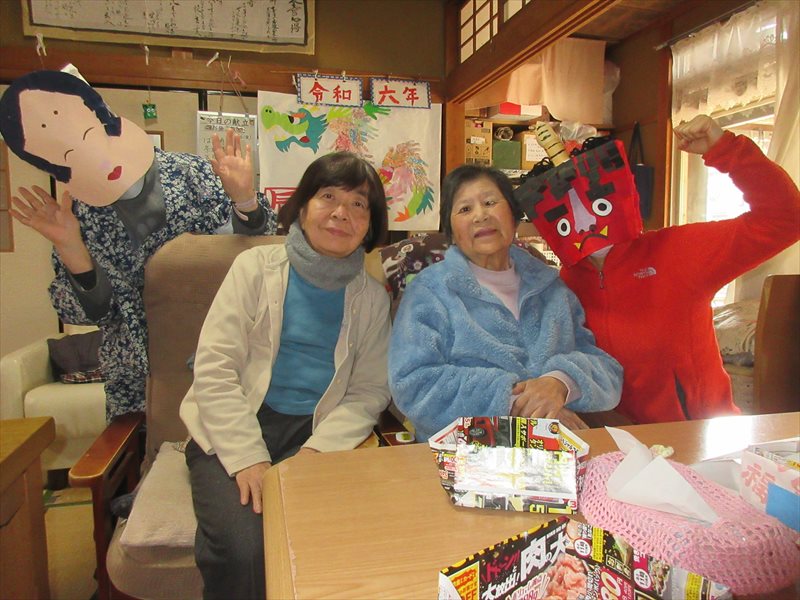2月は、節分で職員が赤鬼やお多福に扮し、3月は、ひな祭りでお内裏様や、お姫様に扮し、その時の様子です。